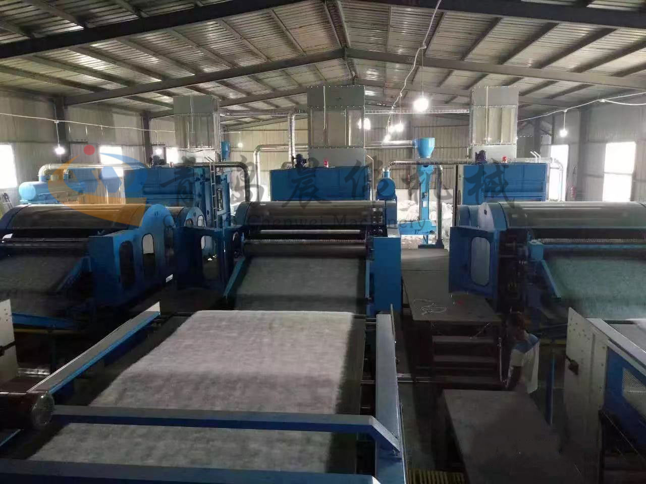 開包機(jī)-開松機(jī)-振動(dòng)給棉機(jī)-梳理機(jī)-鋪網(wǎng)機(jī)-烘房-燙光機(jī)-成卷切片機(jī)