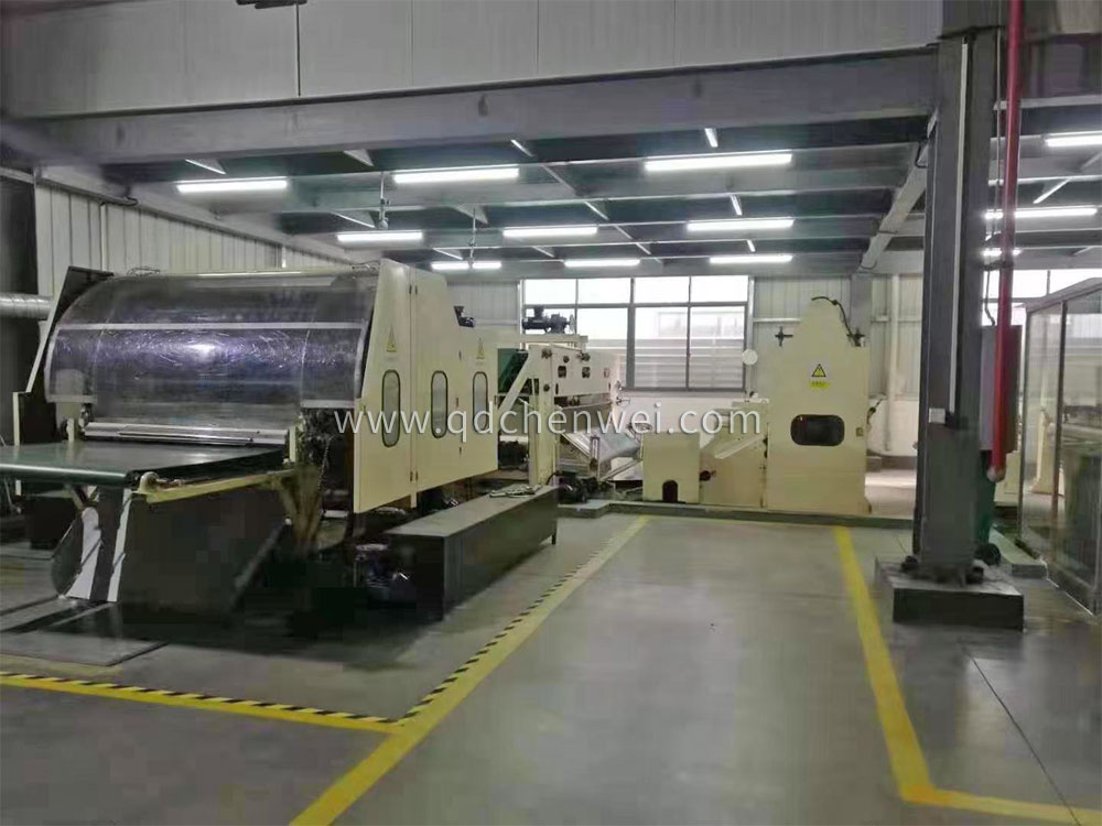 5. CWPW-鋪網(wǎng)機(jī):用于將梳理纖網(wǎng)通過移動(dòng)小車交叉折疊為所需幅寬和定量的多層纖網(wǎng),以供后道工序使用。鋪網(wǎng)輥采用特殊結(jié)構(gòu),加裝壓網(wǎng)輥和導(dǎo)流板,不飄網(wǎng)不起皺,五只大功率電機(jī)精確控制各部件的運(yùn)動(dòng),電動(dòng)輸出簾高度調(diào)節(jié)裝置
