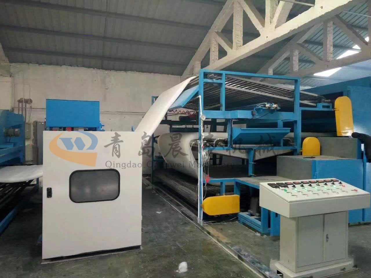 5. CWPW-鋪網(wǎng)機:用于將梳理纖網(wǎng)通過移動小車交叉折疊為所需幅寬和定量的多層纖網(wǎng),以供后道工序使用。鋪網(wǎng)輥采用特殊結(jié)構(gòu),加裝壓網(wǎng)輥和導(dǎo)流板,不飄網(wǎng)不起皺,五只大功率電機精確控制各部件的運動,電動輸出簾高度調(diào)節(jié)裝置